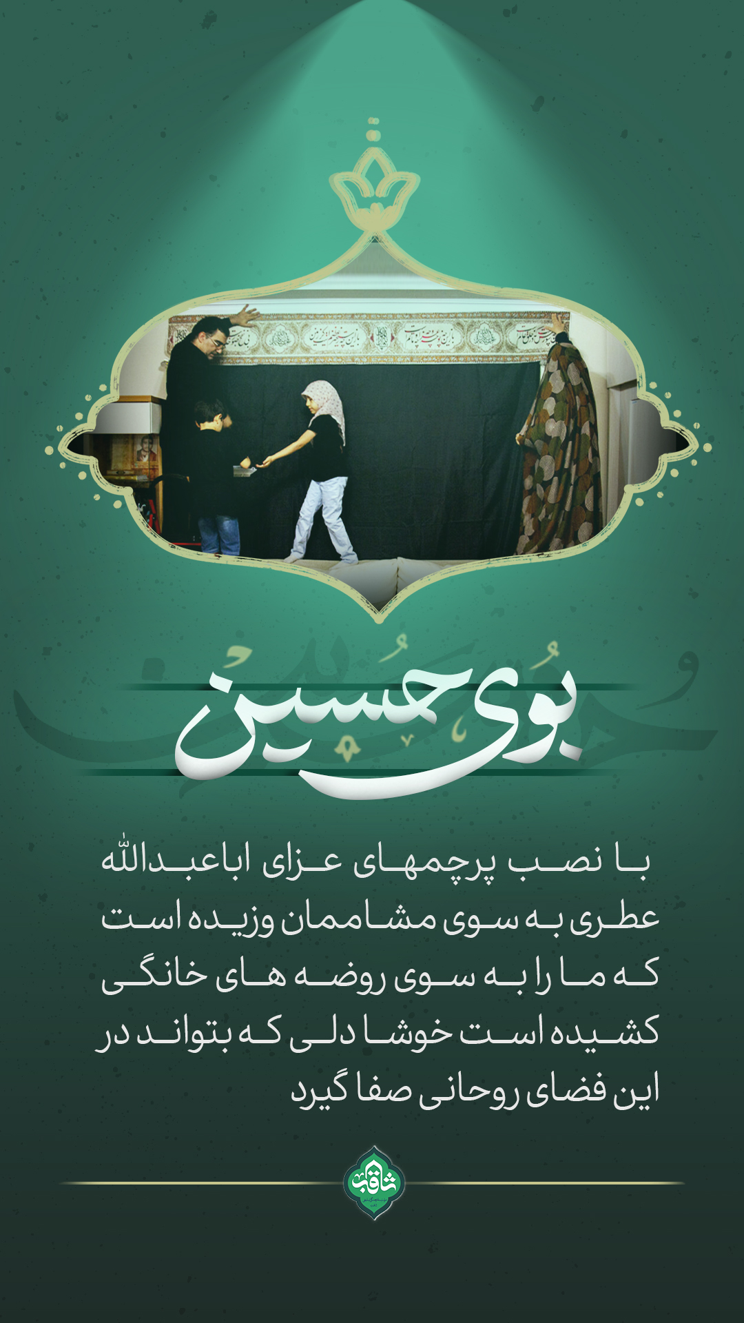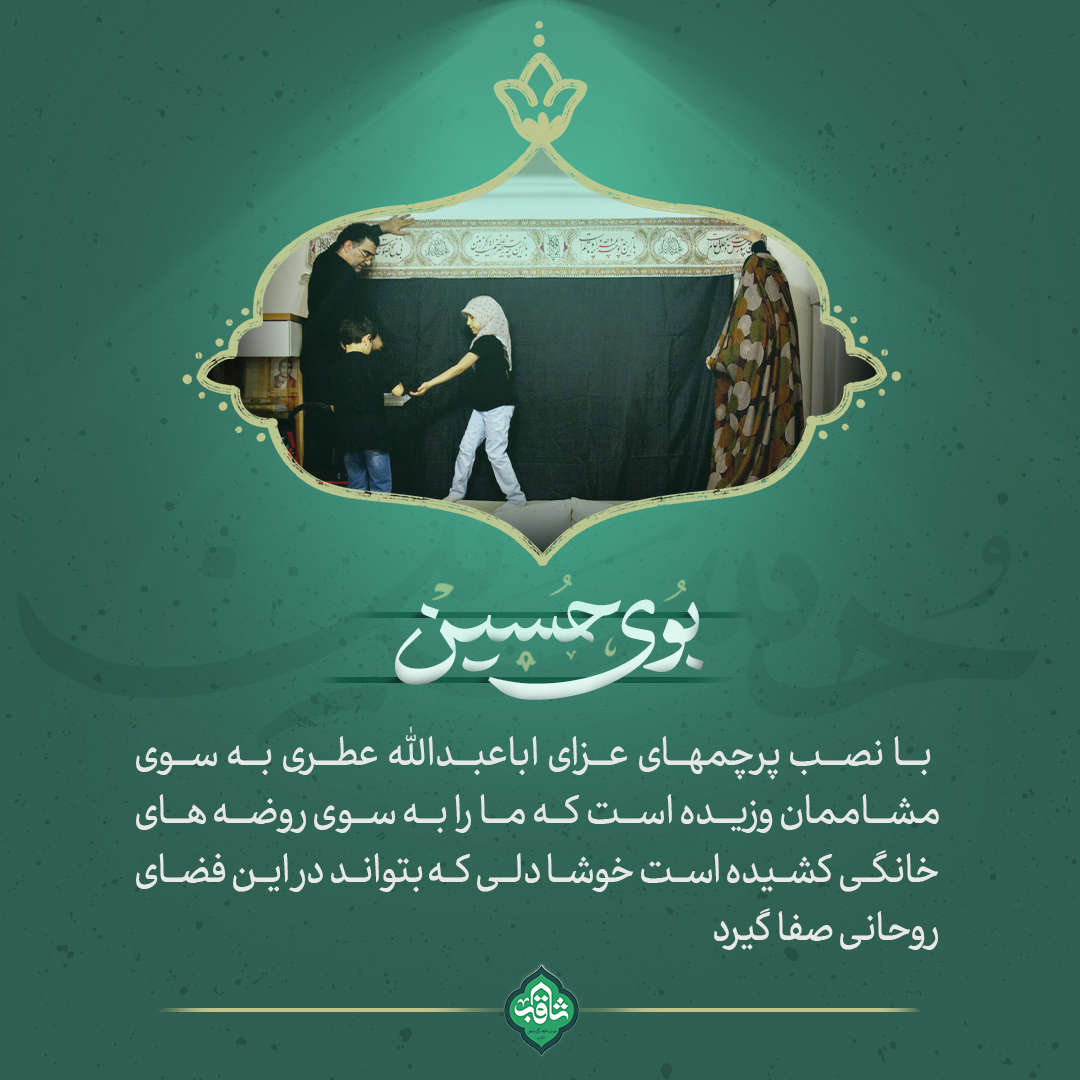 با نصب پرچمهای عزای اباعبدالله علیه السلام عطری بسوی مشاممان می وزد که بوی حسین علیه السلام است. و مارا به سوی روضه های خانگی میکشاند. خوشادلی که بتوانددر این فضای روحانی صفا گیرد.