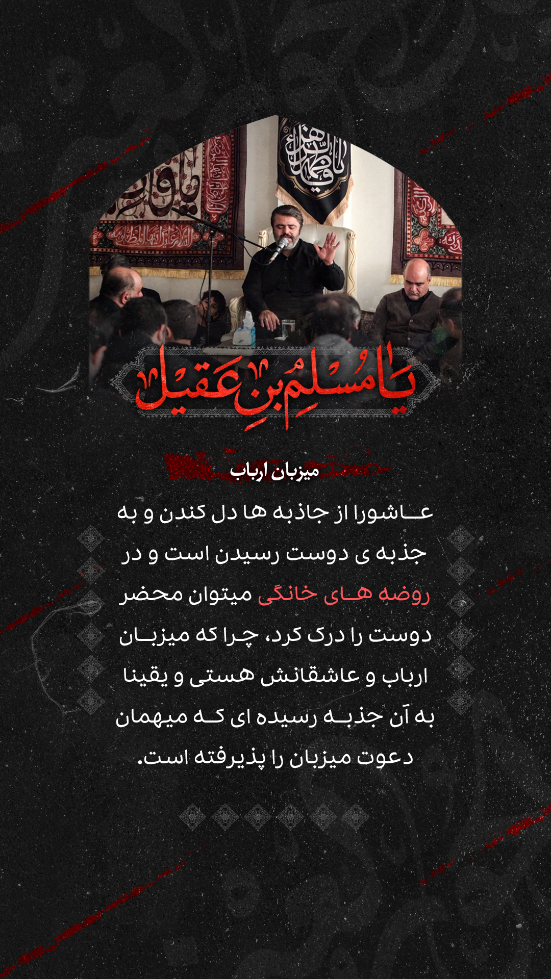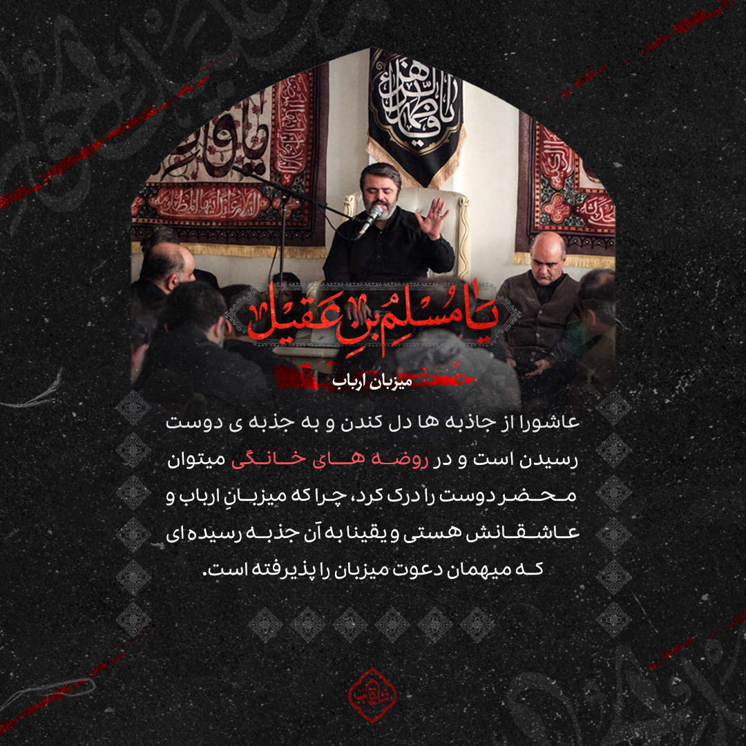 عاشورا از جاذبه ها دل کندن و به جذبه ی دوست رسیدن است و در روضه های خانگی میتوان محضر دوست را درک کرد. چرا که دعوت ارباب نصیبت شده و میزبان ارباب و عاشقانش هستی و یقینا به آن جذبه رسیده ای که میهمان دعوت میزبان را پذیرفته است.