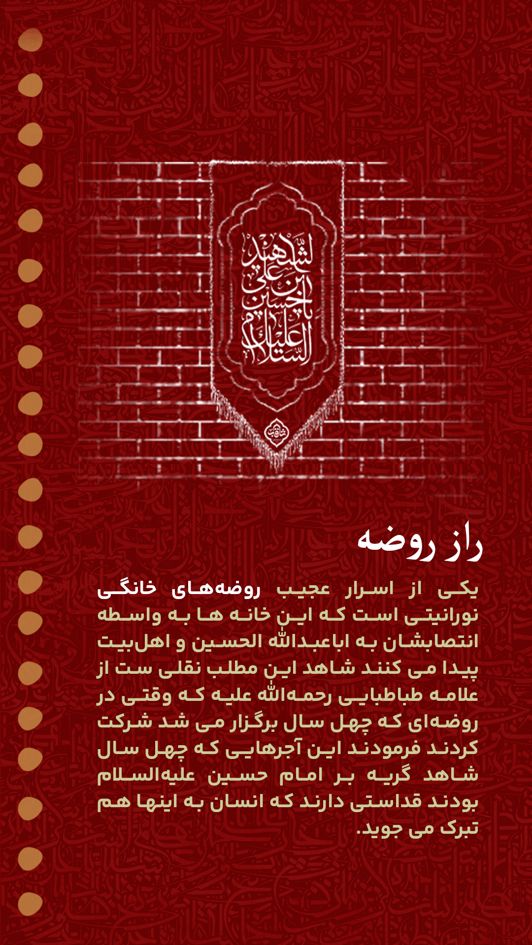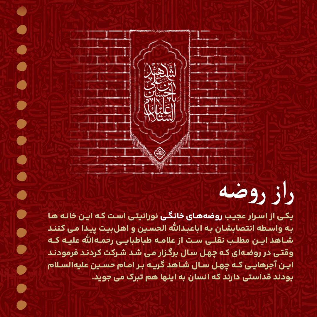 یکی از اسرار عجیب روضه های خانگی، نورانیتی است که این خانه ها به واسطه انتصابشان به اباعبدالله الحسین و اهل بیت پیدا می کنند شاهد این مطلب نقلی ست از علامه طباطبایی رحمه الله علیه که وقتی در روضه ای که چهل سال برگزار می شد شرکت کردند فرمودند این آجرهایی که چهل سال شاهد گریه بر امام حسین علیه السلام بودند قداستی دارند که انسان به اینها هم تبرک می جوید