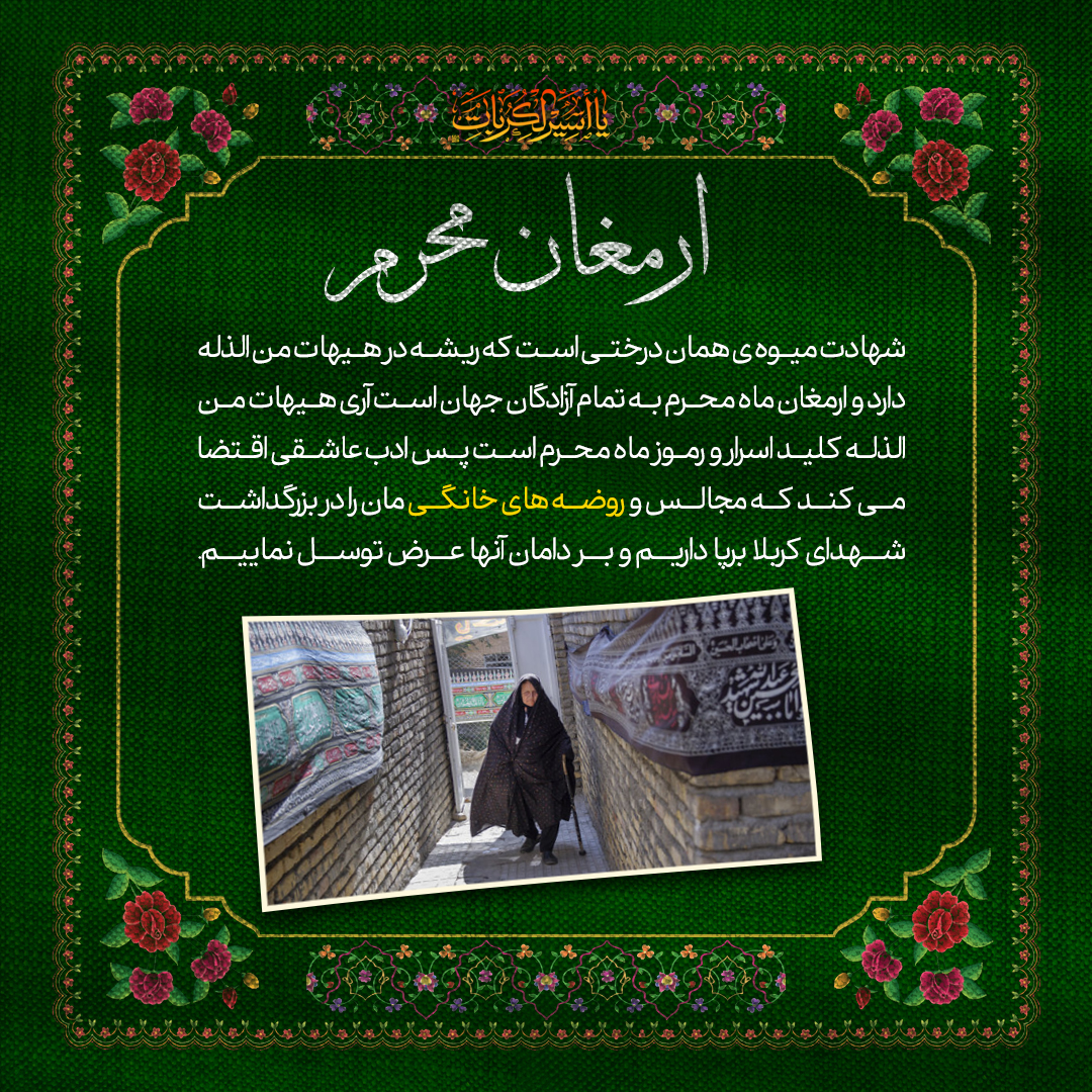 شهادت، میوه ی همان درختی است که ریشه در هیهات من الذله دارد و ارمغان ماه محرم به تمام آزادگان جهان است. آری هیهات من الذله کلید اسرار و رموز ماه محرم است، پس ادب عاشقی اقتضا می کند که مجالس و روضه های خانگیمان را در بزرگداشت شهدای کربلا برپا داریم و بر دامان آنها عرض توسل نماییم.