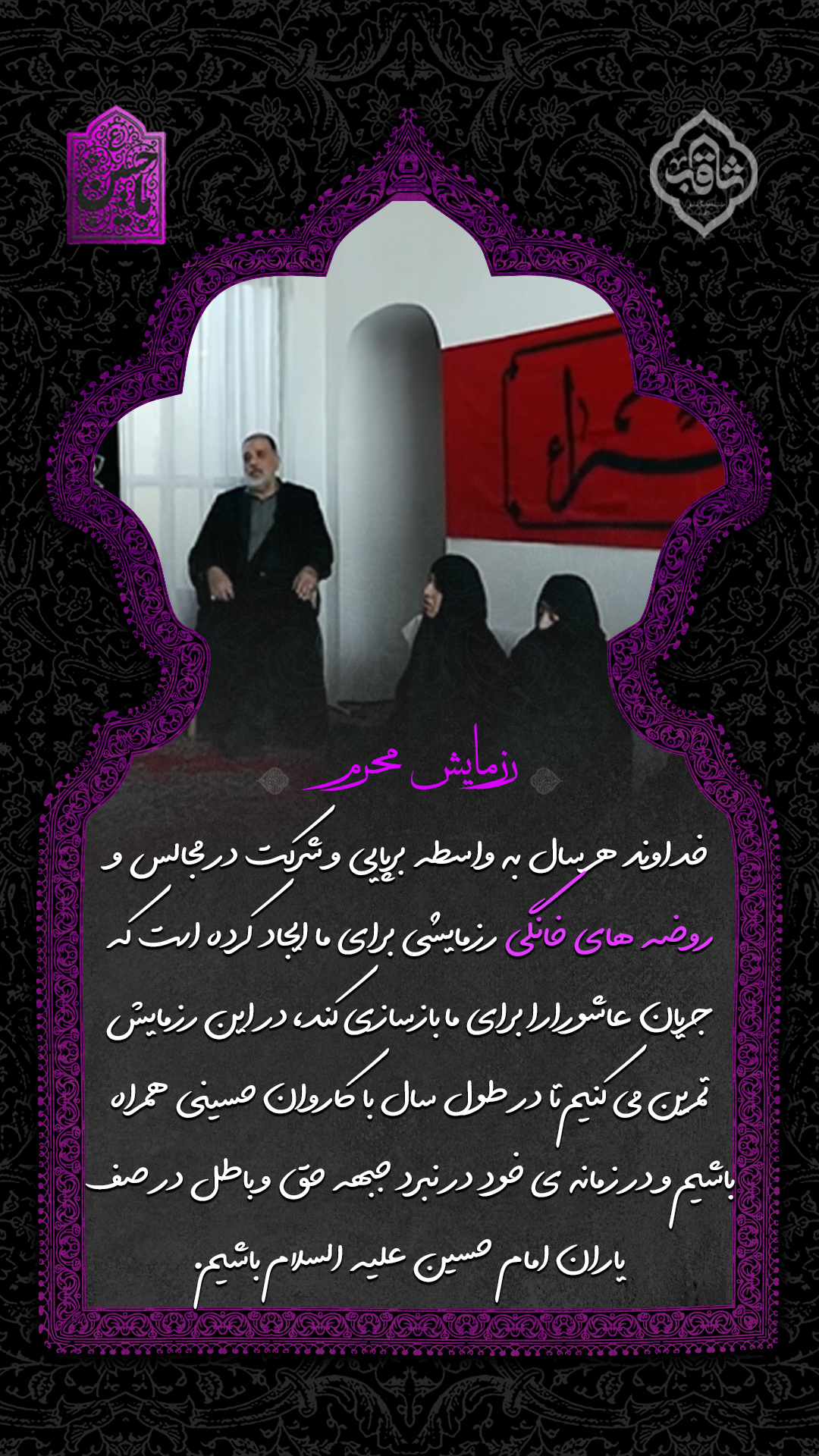 خداوند هر سال به واسطه برپایی و شرکت در مجالس و روضه های خانگی، رزمایشی برای ما ایجاد کرده است که جریان عاشورا را برای ما بازسازی کند، در این رزمایش تمرین می کنیم تا در طول سال با کاروان حسینی همراه باشیم و در زمانه ی خود در نبرد جبهه حق و باطل در صف یاران امام حسین علیه السلام باشیم.