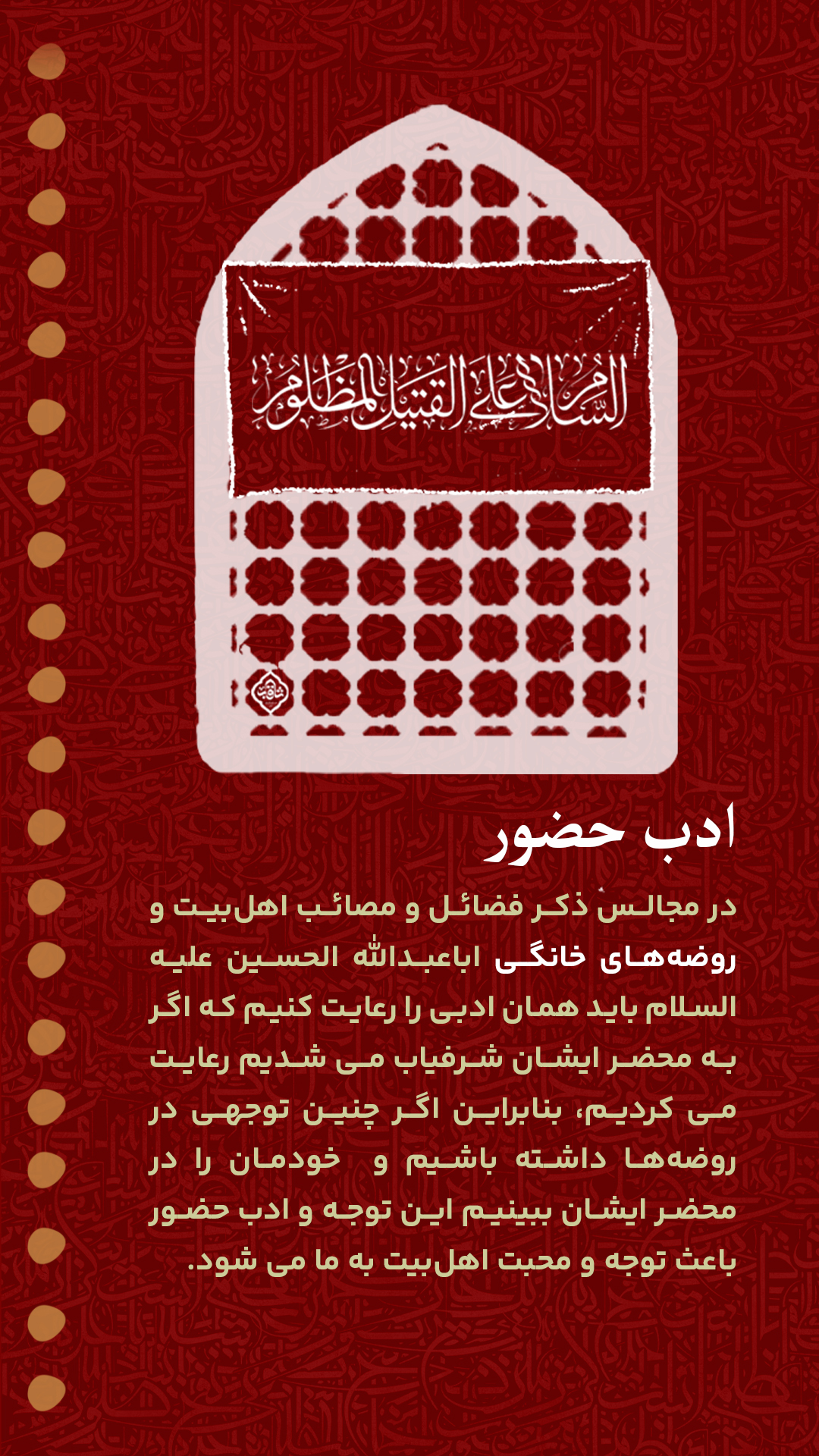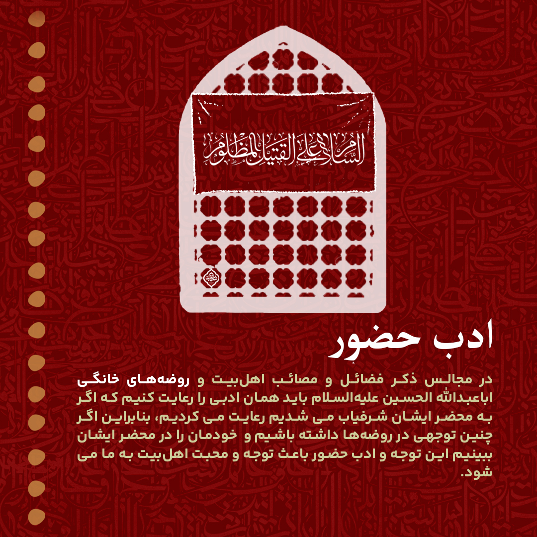 در مجالس ذکر فضائل و مصائب اهل بیت (ع) و روضه های خانگی اباعبدالله الحسین علیه السلام باید همان ادبی را رعایت کنیم که اگر به محضر ایشان شرفیاب می شدیم رعایت می کردیم بنابراین اگر چنین توجهی در روضه ها داشته باشیم و خودمان را در محضر ایشان ببینیم، این توجه و ادب حضور باعث توجه و محبت اهل بیت (ع) به ما می شود.