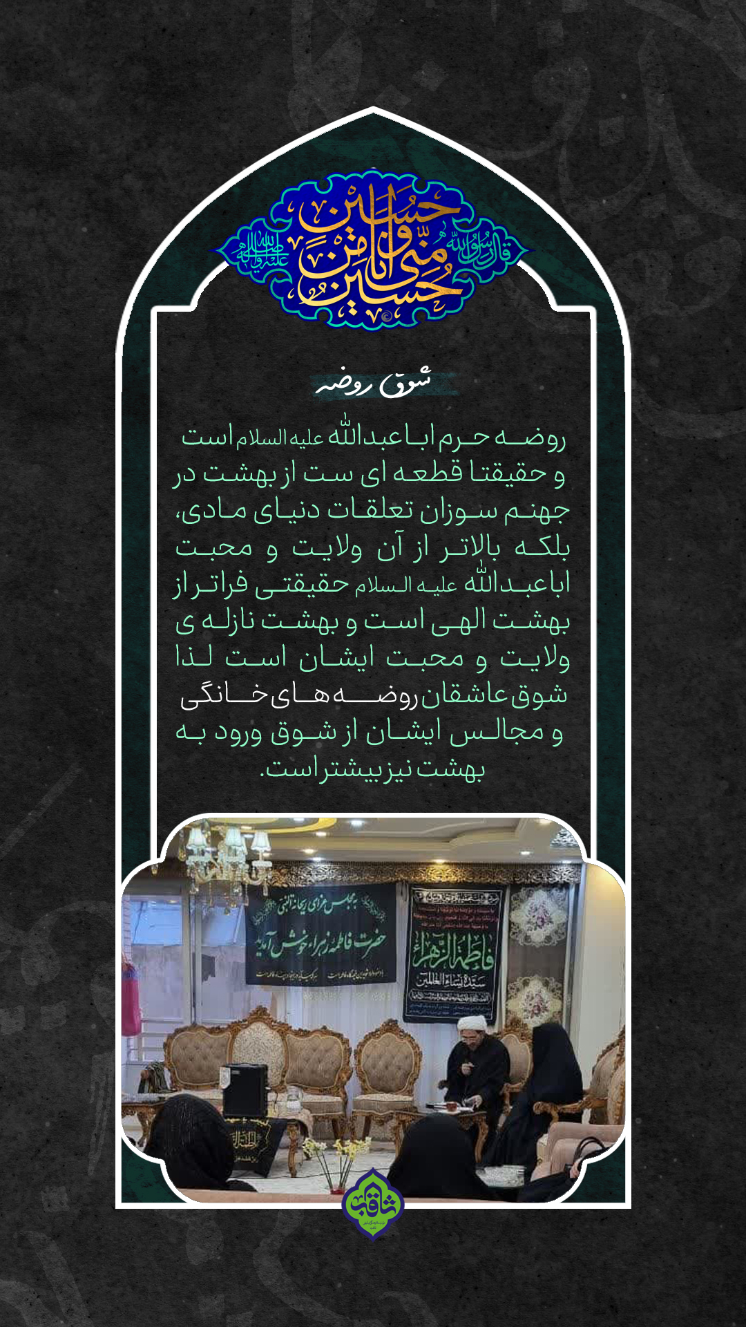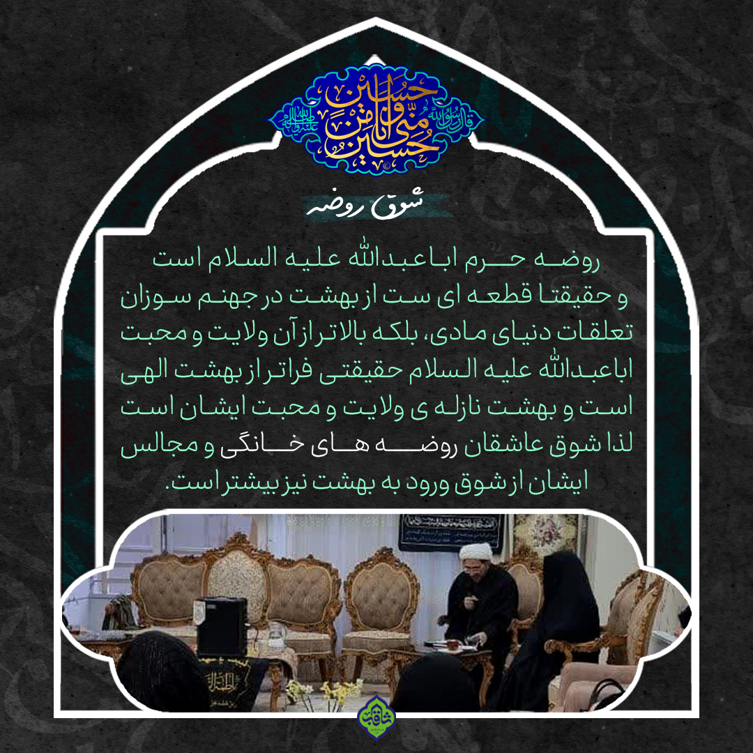 روضه، حرم اباعبدالله علیه السلام است و حقیقتا قطعه ایست از بهشت. در جهنم سوزان تعلقات دنیای مادی، بلکه بالاتر از آن ولایت و محبت اباعبدالله علیه السلام حقیقتی فراتر از بهشت الهی است و بهشت نازله ی ولایت و محبت ایشان است؛ لذا شوق عاشقان روضه های خانگی و مجالس ایشان، از شوق ورود به بهشت نیز بیشتر است.