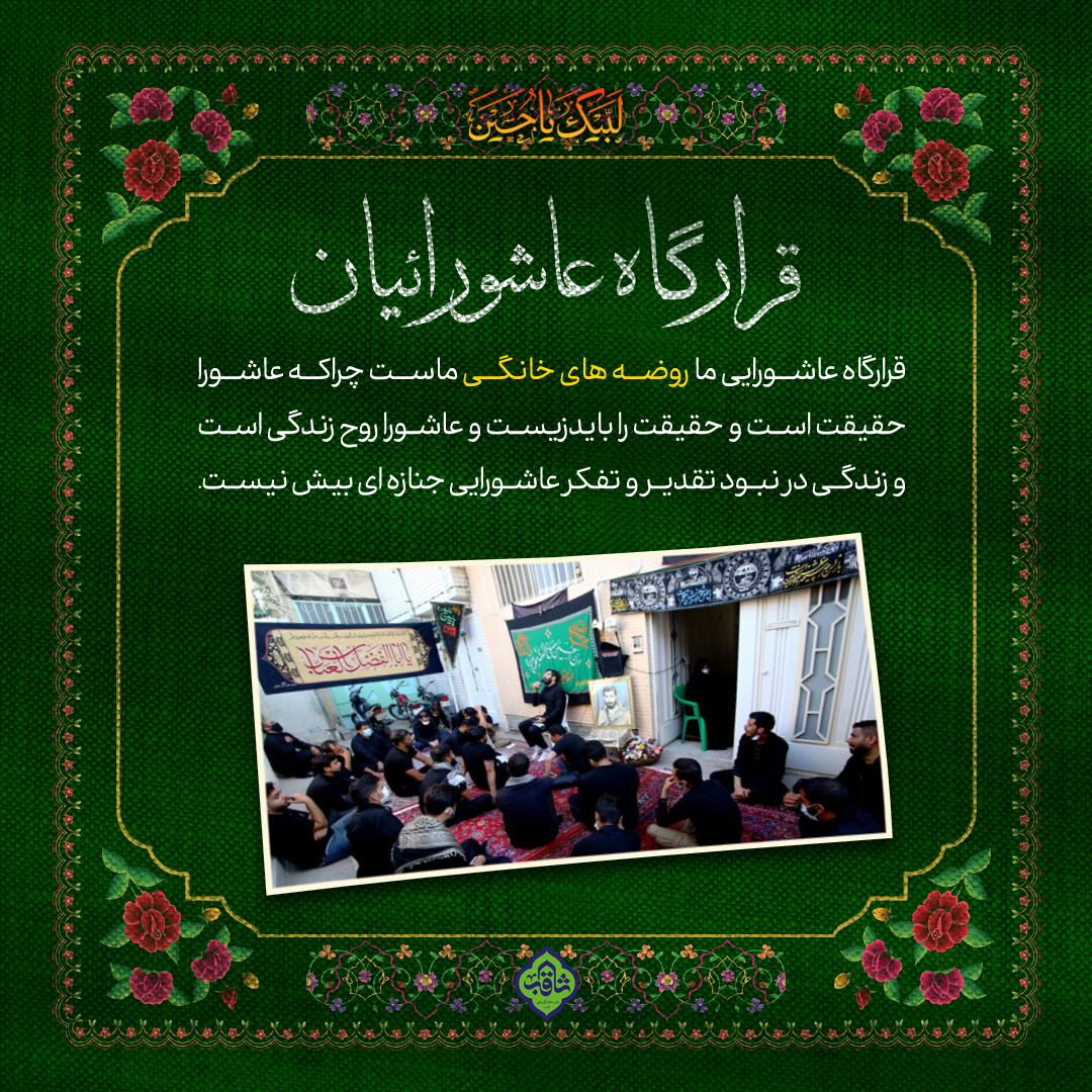 قرارگاه عاشورایی ما، روضه های خانگی ماست چرا که عاشورا، حقیقت است و حقیقت را باید زیست و عاشورا روح زندگی است و زندگی در نبود تقدیر و تفکر عاشورایی، جنازه ای بیش نیست.